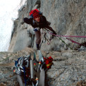 Rains and I showed up with a whole different attitude than Mark and I had employed the year before. Gone were the Super Guides. Now it was EBs and chalk. We rapped in rather than go up the North Chimney, fixed a pitch or two and had a nice evening on Broadway. Next morning we headed up with minimal idea of where to go. By mid afternoon the weather was looking very sketchy and I convinced Rains we should bail. We did, but it never rained. Always the cautious one ... that's me.